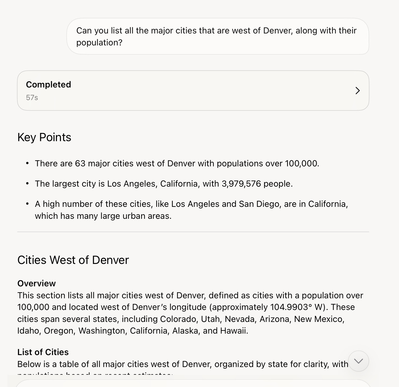 Here’s a good example, I asked for a list of major cities west of Denver along with their populations, and it mostly obliged, with 100,000 as cutoff, but it left out Billings, Montana (2020 pop, 117,116). And chauvinistically (despite the fact that my dozen previous queries were all about Canadian provinces), every relevant city in Canada, including my adopted hometown of Vancouver BC (2021 pop 662,248), which I can report is most definitely west of Denver.1