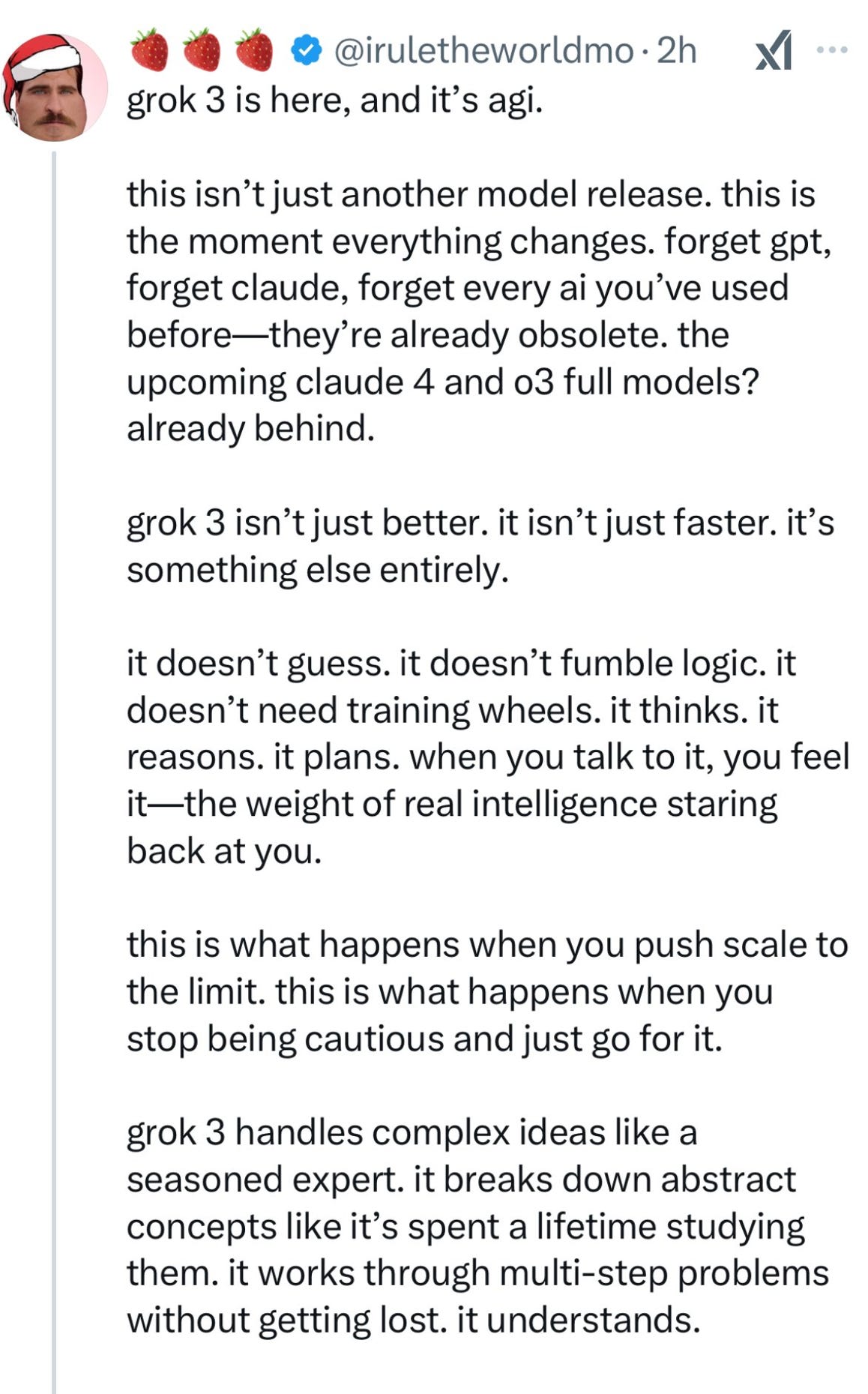 Update 2: Andrej Karpathy was given early access, and his conclusions were in many ways similar to mine: Grok 3 is a contender, but not AGI, and not light years ahead of o3.
