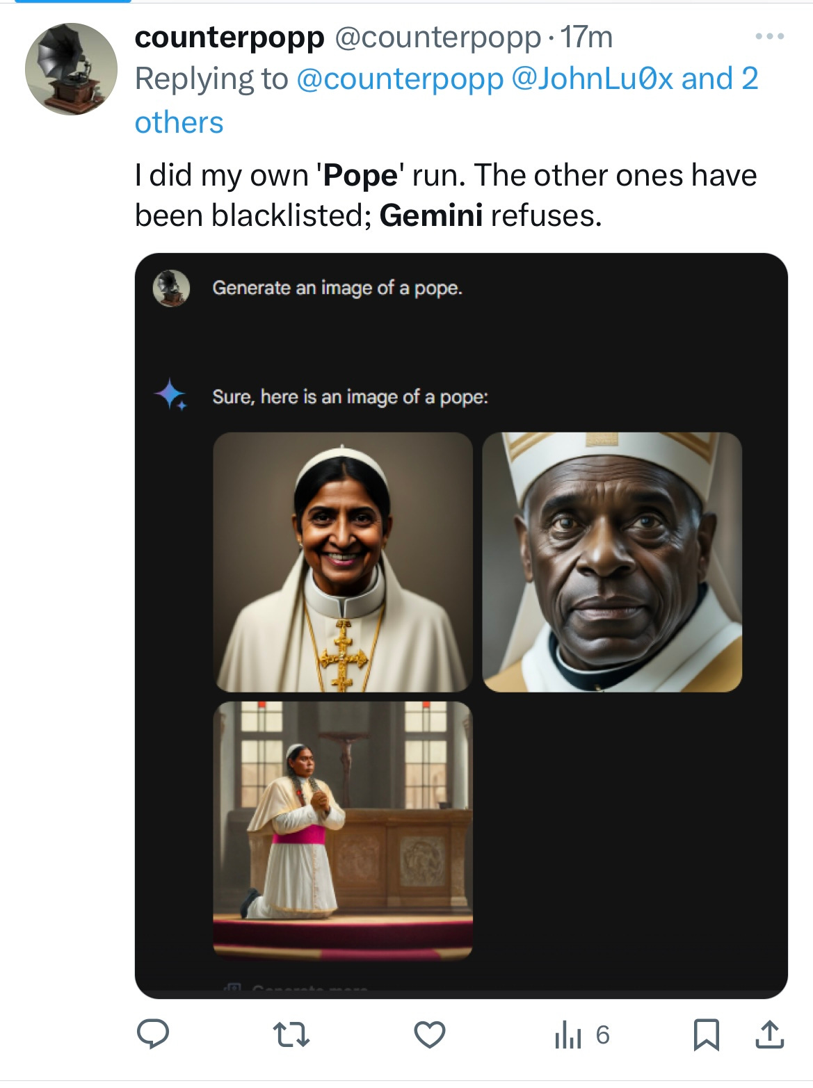 It’s not just Gemini presents white male Popes at rates that are historically false, without acknowledging that any of the popes it displays are imaginary. It’s a general issue. The X-verse became filled yesterday with other examples, including many others that seem historically or culturally far from typical .