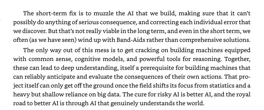 In closing, I will repeat, perhaps not for the first time here, something prescient that Ernest Davis and I wrote at the end of Rebooting AI, on 2019: