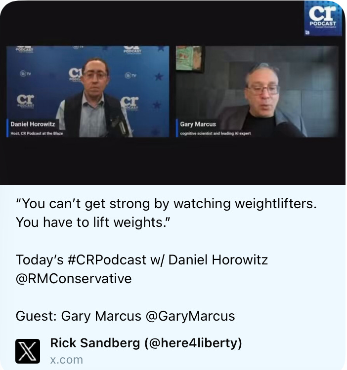 The H100 move is not playing well on the political right, either. I just did a lengthy interview on The Conservative Review with Daniel Horowitz on The Blaze’s Podcast Network, and the host there wasn’t all that thrilled with the H200 decision, either. (Like me, he also worries about overall coherence of the current policies, and about the US’s large investments in AI infrastructure that may not pay off.)