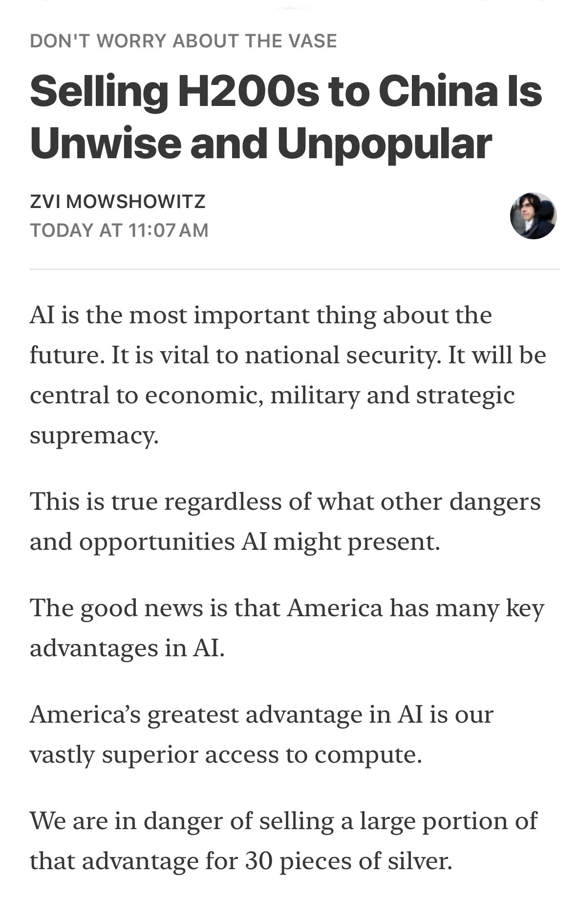 As anticipated here yesterday, Trump’s decision to allow Nvidia to sell H200s to China hasn’t gone over well. Here for example is AI analyst Zvi Mowshowitz’s take: