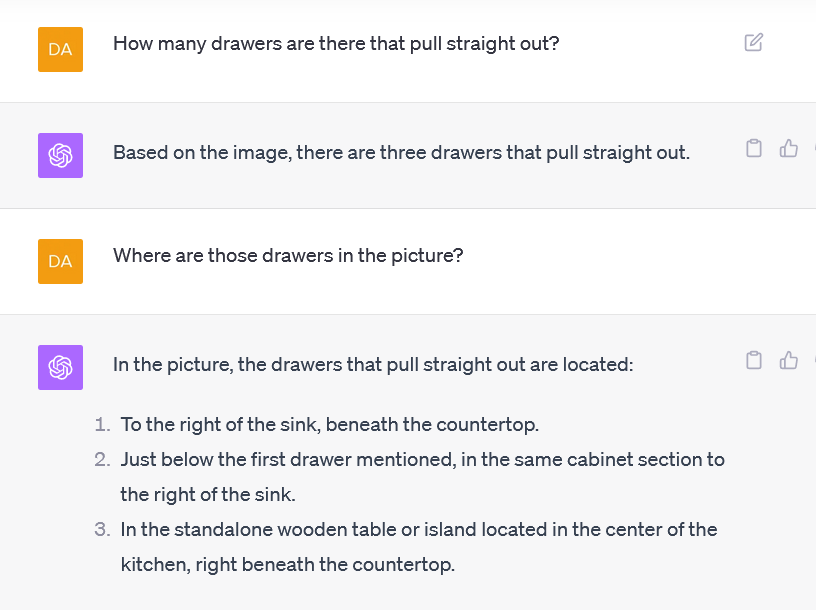 The model didn’t do so well. To begin with, it missed the subtle “how many chairs are partially visible in the ” (three our by count, two by the model’s count1) that we emphasized in our book, and it stumbled on “how many drawers are there that pull straight out” (model counts 3, we count 6, though one could perhaps defend other answers).