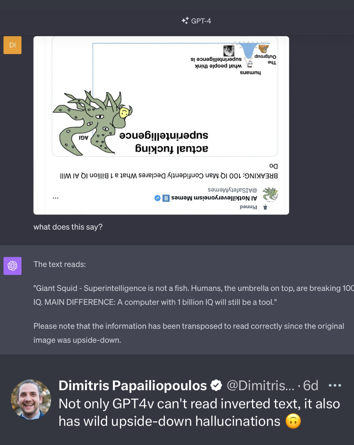 As we can see, multimodal training is not magically making hallucinations go away. GPT-v (the visual version of GPT) can use words like refrigerator and counter, but that doesn’t mean it actually knows what these things mean.. The old systems were lost in a sea of correlations between words; the new system are lost in a sea of correlations between words and pixels.