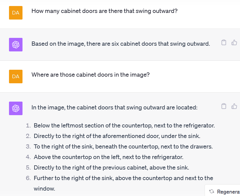 But then things got even more interesting. ChatGPT went utterly wild when Ernie pushed on the last one, omitting some that are there and and confabulating a standalone island in the middle of the kitchen that simply isn’t there: