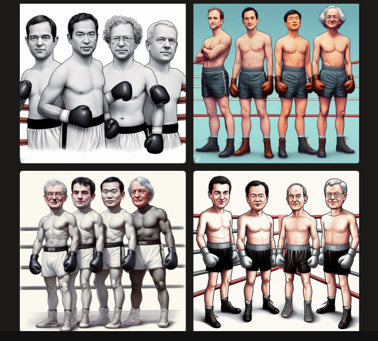 Bing,powered by Dall-E 3, was an even bigger loser, drawing “Hinton vs LeCun vs Ng vs Tegmark, boxing” with four boxers not boxing, not one of them looking remotely like any of our heroes: