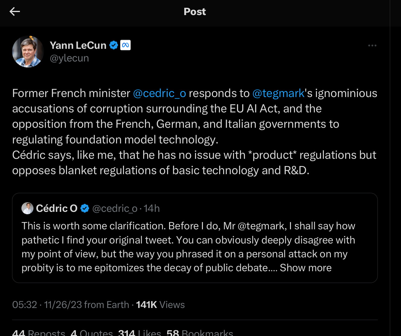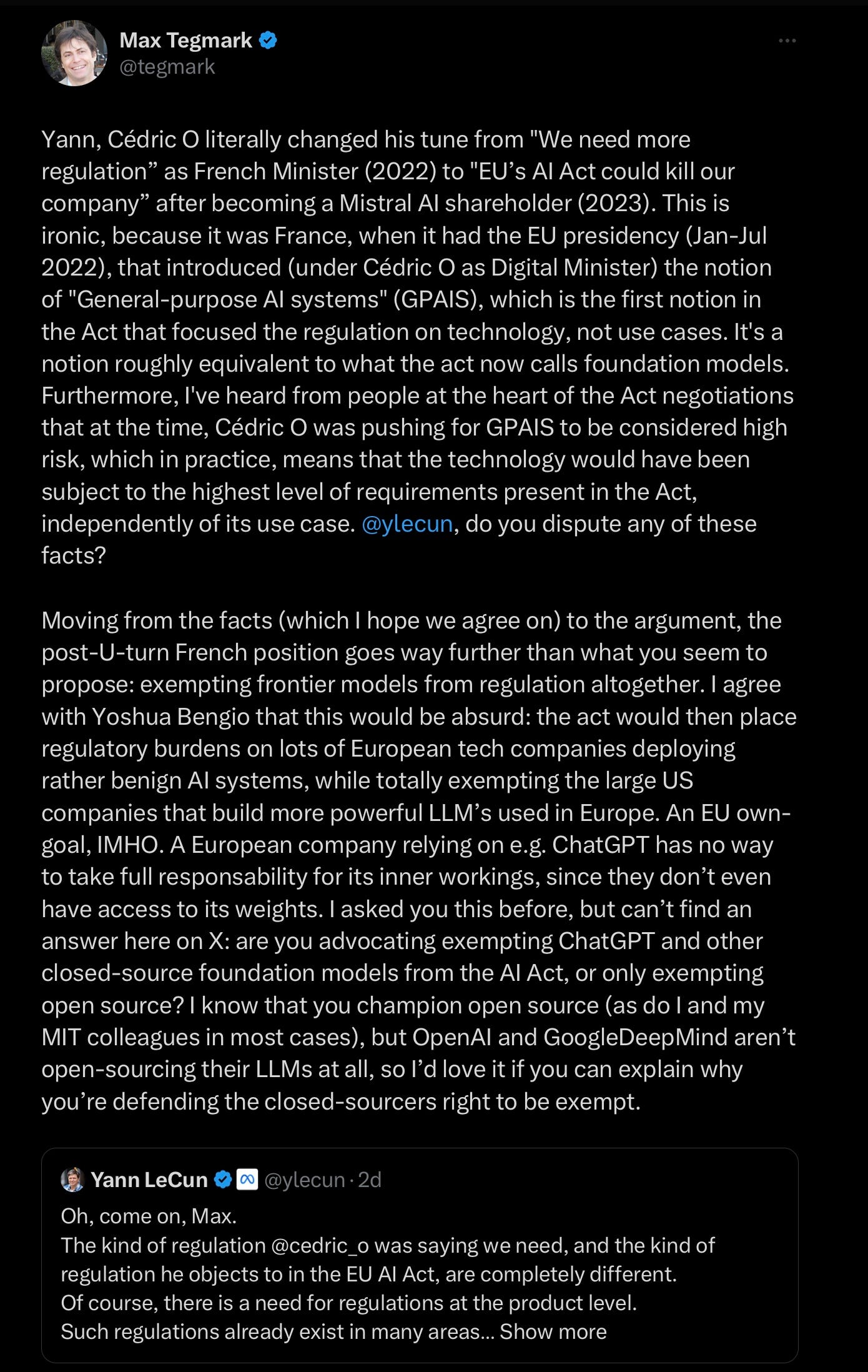 If last weekend’s OpenAI drama was top-billing, the can’t-look-away undercard was four heavyweights, Hinton, LeCun, Ng, and Tegmark slugging it out on X, briefly joined by former French Minister Cedric O, now working at a French LLM startup, Mistral, and arguably having pulled a 180 with respect to regulation.