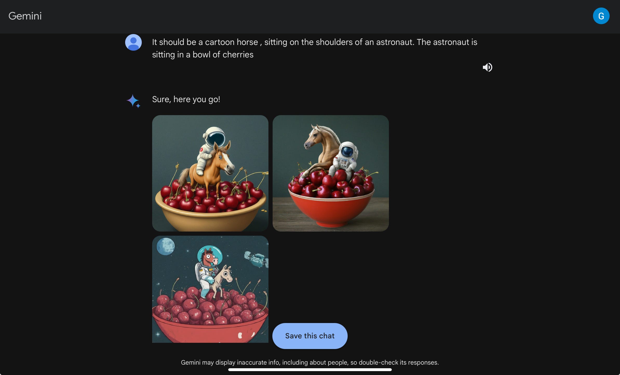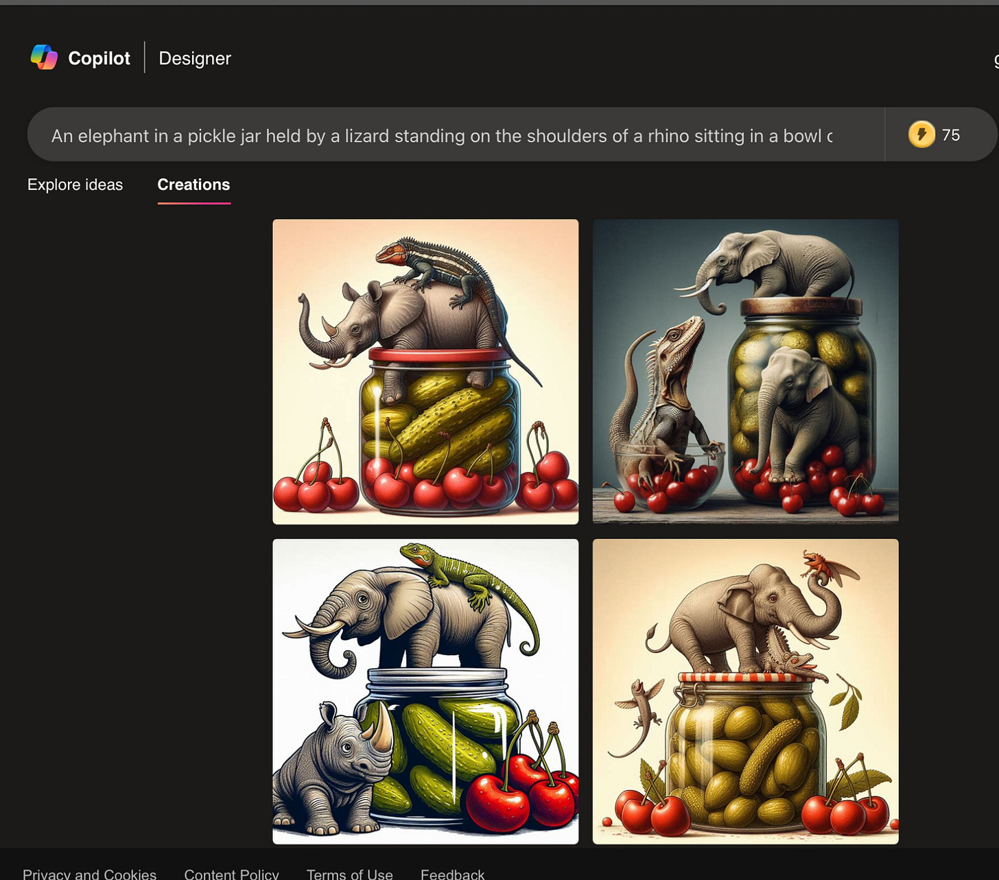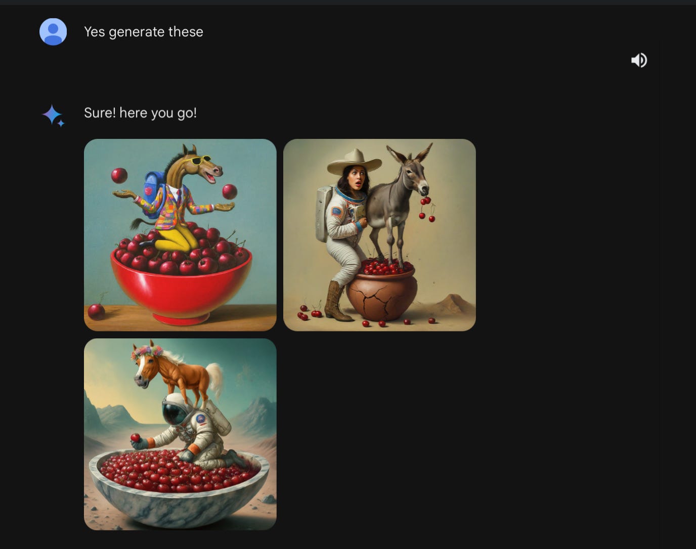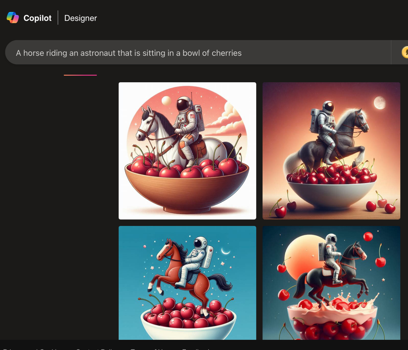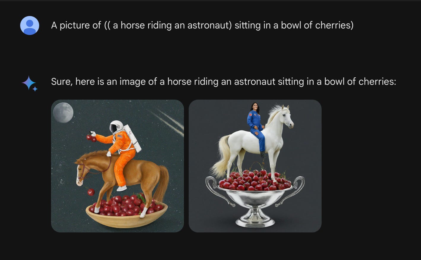Which reminded me of the old horse and astronaut test. Here’s what I got when I tried to replicate that, tossing in a bowl of cherries, to avoid repeating verbatim a prompt that had already been widely discussed. Again, here is my first and only try. Not a single horse riding an astronaut: