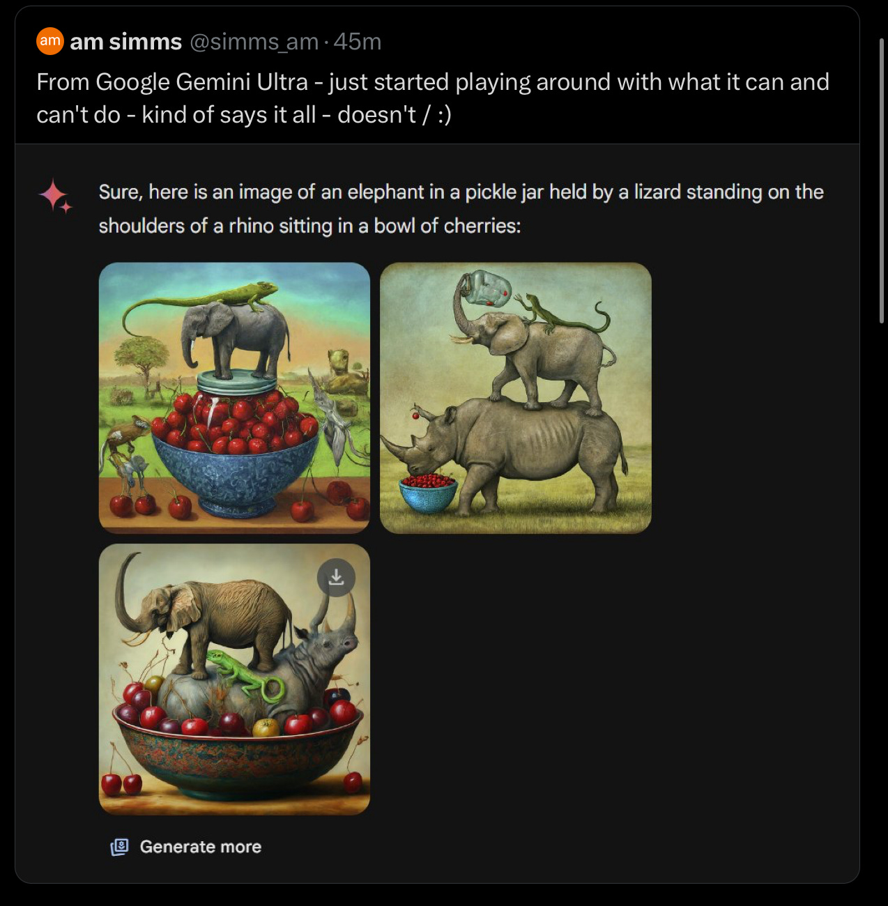 Fast forward to tonight, and year of constantly hyped “astonishing progress”, and someone on X posted a Gemini Ultra example that reminded me of the familiar pattern: