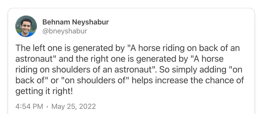 In other words, the problem was with its language understanding, rather than with illustration per se. The model was perfectly capable of drawing a horse riding an astronaut, it just didn’t know that the phrase horse rides astronaut was a request for a horse riding an astronaut.