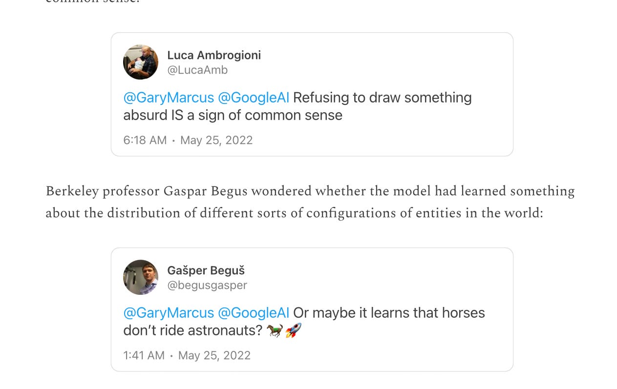 Evelina Leivada and Elliott Murphy and I further replicated and extended that finding in arXiv, in October 2022,, in a study called “DALL-E 2 Fails to Reliably Capture Common Syntactic Processes”.