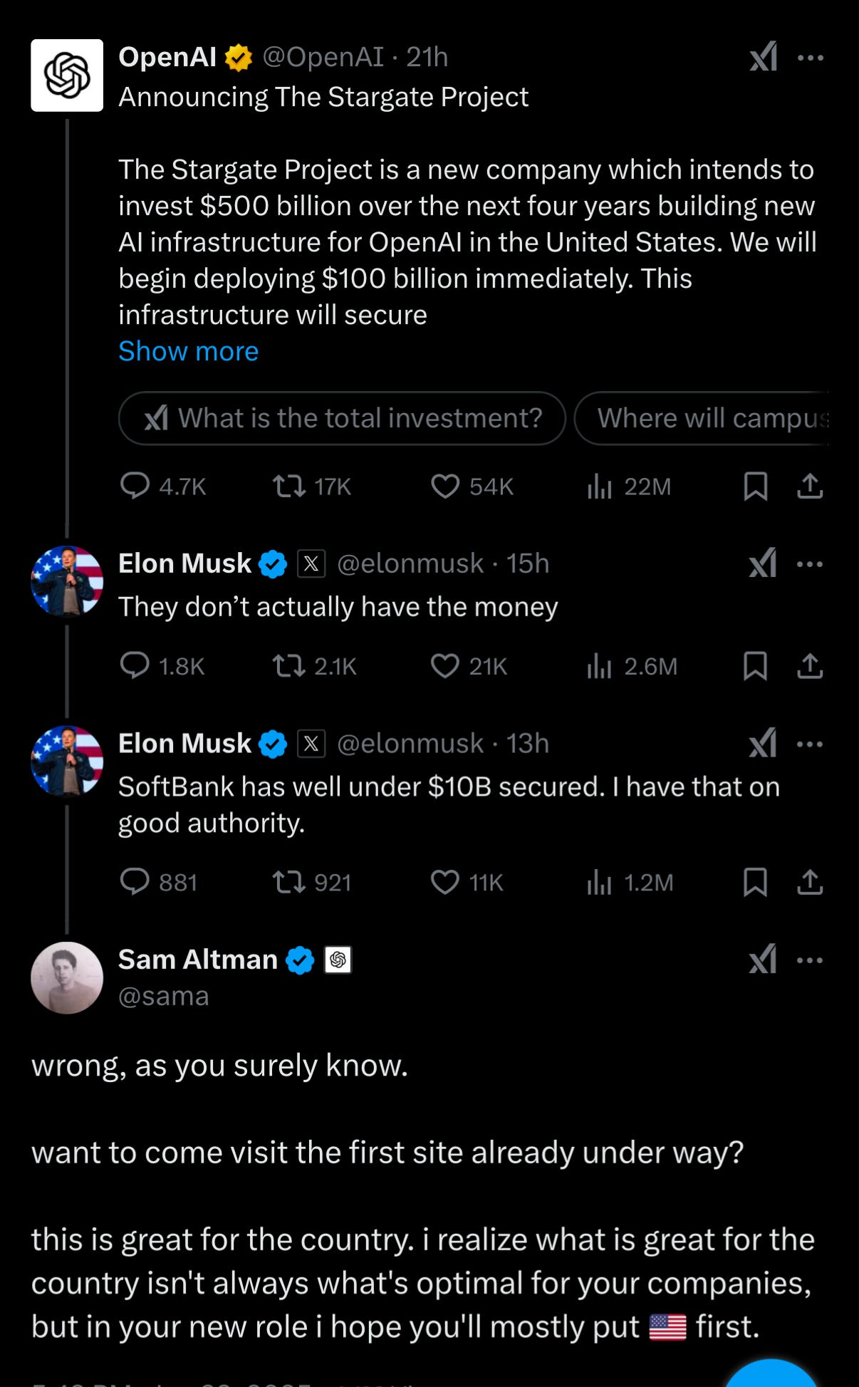 Yesterday OpenAI announced a huge infrastructure project, partly framed as pushing the U.S. ahead, and Elon had words for Sam.