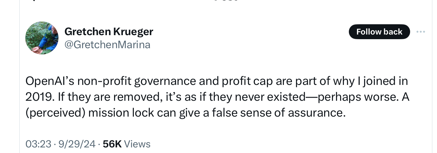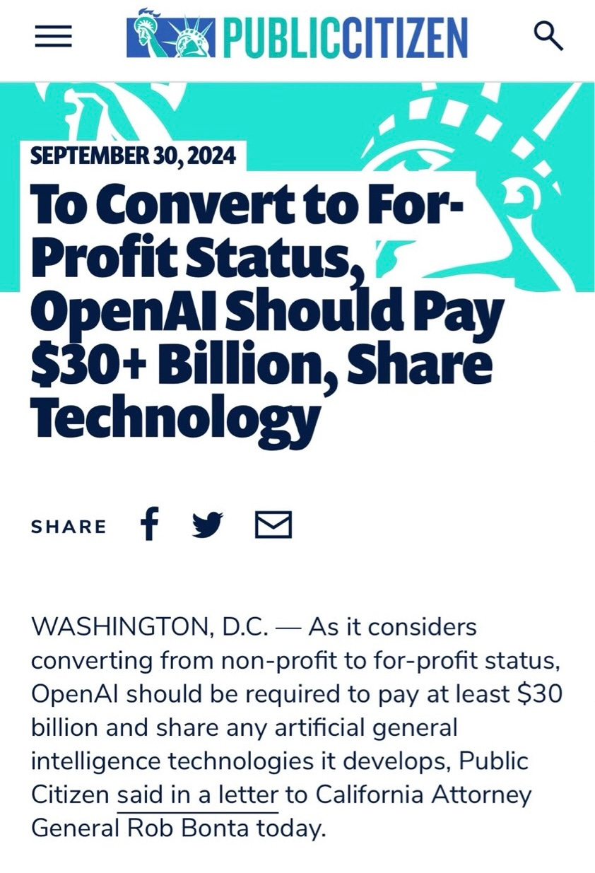 Now OpenAI wants to renege on its promises, and become a for-profit. Nobody should able to make that switch for free, at no cost, or people will exploit nonprofit rules infinitely, going forward.