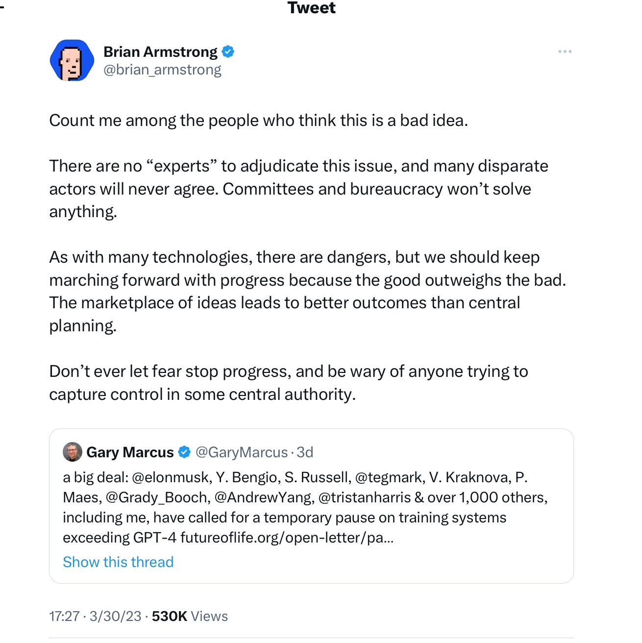It was definitely too hypey around the imminence of artificial general intelligence (I held my nose on that point); there is no obvious way to get ensure compliance; China might go ahead anyway; we don’t even know how to evaluate the proposed ban’s main criterion. (The ban called for halting systems more powerful than GPT-4, presumably as indexed by size and we don’t even know how large GPT-4 is; again, I held my nose, having seen the letter only after a bunch of signatories had already signed on.)
