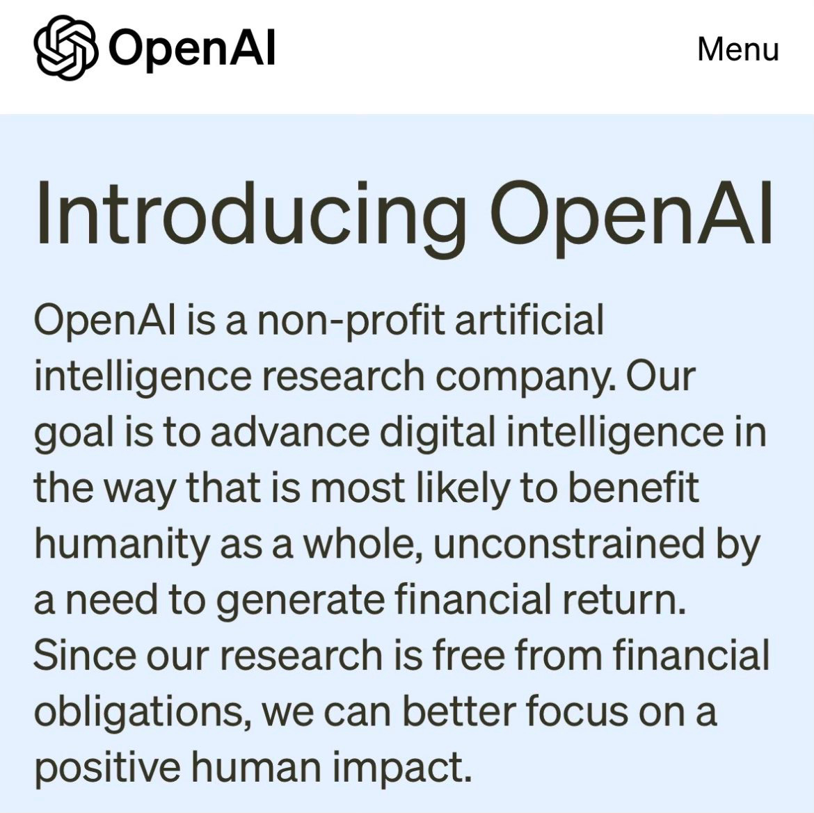 to a company that at present for all practical purposes is a for-profit, heavily constrained by the need to generate a financial return, working around Microsoft’s goals, with far less emphasis on the admirable humanitarian goals in their initial charter. Their 10 billion dollar deal earlier this year accelerated that transition.
