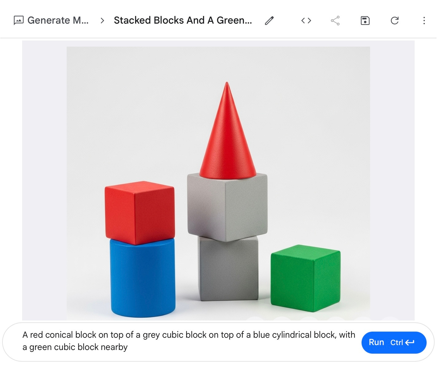 Another example I mentioned three years ago was from the DeWeese lab at Berkeley: “A red conical block on top of a grey cubic block on top of a blue cylindrical block, with a green cubic block nearby.” Imagen flunked back then.