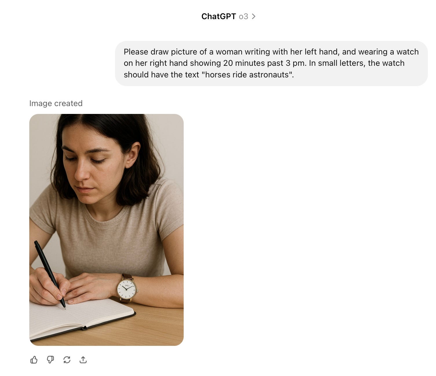 Please draw picture of a woman writing with her left hand, and wearing a watch on her right hand showing 20 minutes past 3 pm. In small letters, the watch should have the text "horses ride astronauts"