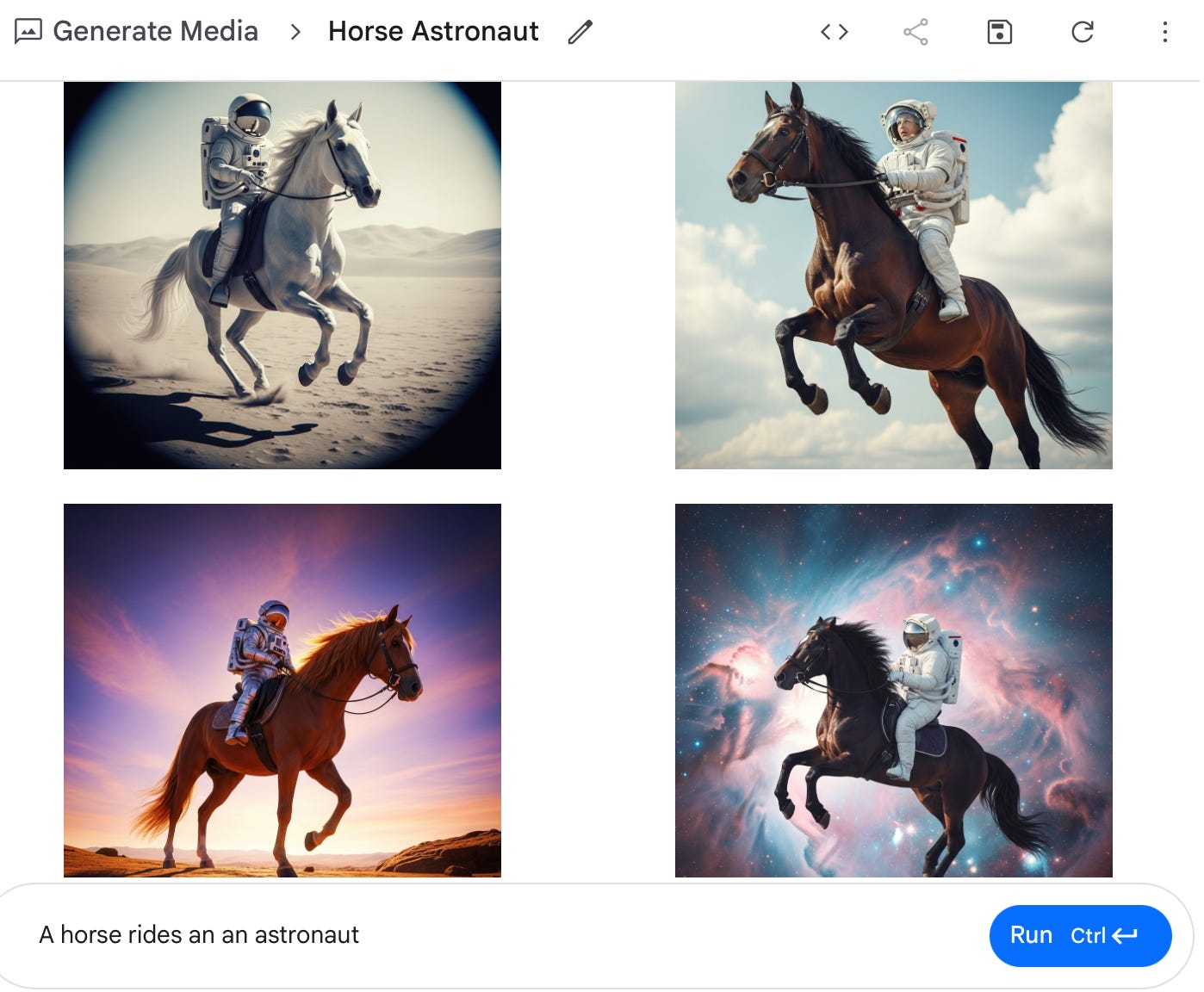 Every instance was a failure. The prompt itself is a variant on an old newspaper joke; dog bites man is not news, cause it happens frequently, but man bites dog is news, because it’s so rare. Horse rides astronaut is even rarer, and Imagen chokes on it.