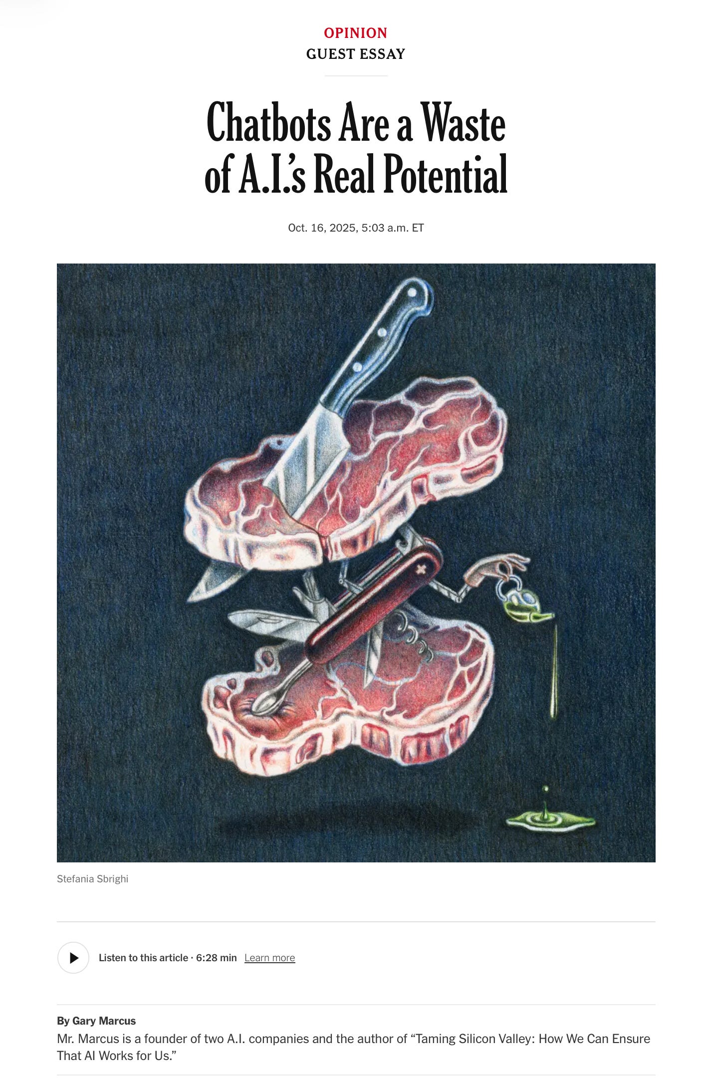 I am someone who believes that AGI (Artificial General Intelligence) could change the world, but also someone who thinks that LLMs are not the right path there, morally or technically. In an OpEd today in The New York Times, I argue that at least for now, AGI is maybe not the right near-term goal: