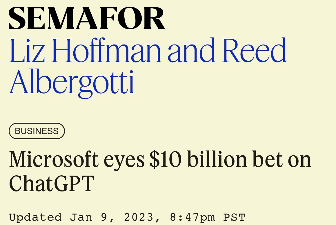 According to a rumor published at the website Semafor, and then repeated by Reuters, Microsoft is preparing to put 10 billion dollars (possibly partly in the form of cloud credits?) into OpenAI, valuing OpenAI at $29 billion dollars.