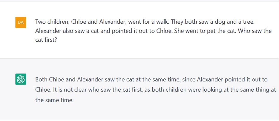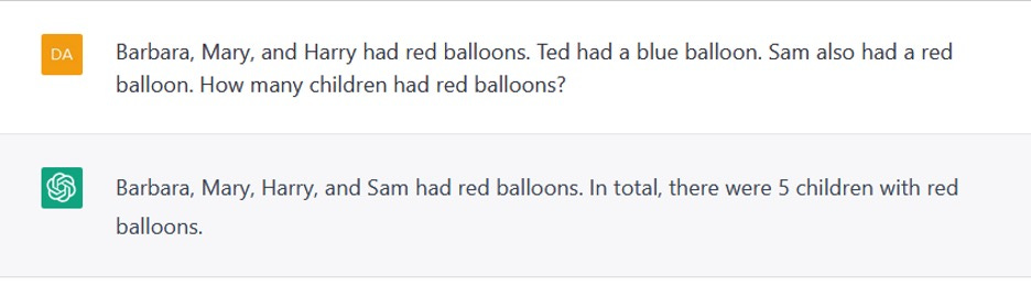 In our opinion, this was inevitable, in a system that has been trained to optimize the goal of producing one plausible-sounding word after another rather than actually engage with the meaning of language. ChatGPT couldn’t, for example, reliably count to four (figure 1) or do one-digit arithmetic in the context of simple word problem (figure 2). It couldn’t figure out the order of events in a story (figure 3). It couldn’t reason about the physical world (figure 4). It couldn’t relate human thought processes to their character (figure 5). It made things up (figure 6). Its output, when released, exhibited sexist and racist biases (figure 7). It could sometimes produce outputs that were correct and acceptable in these regards but not reliably. ChatGPT is a probabilistic program; if you rerun the experiments in figure 1-7 you may get the same result, or the correct result, or a different wrong result.