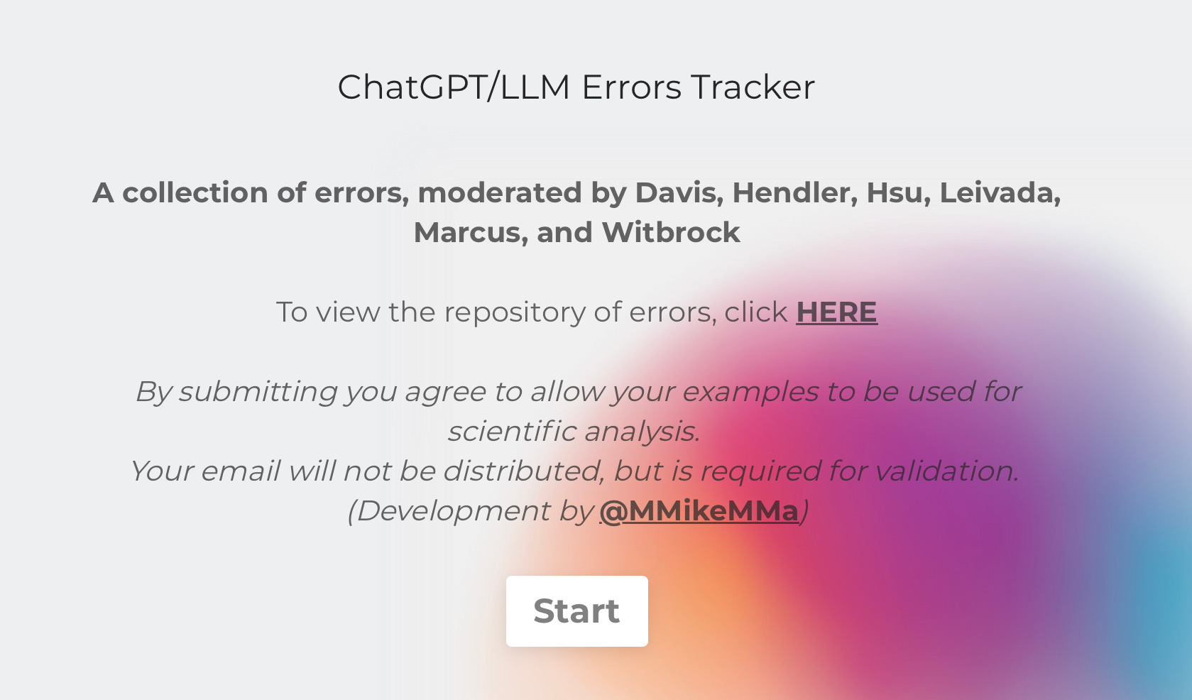For all these reasons, we recently decided to put together a community-facing corpus of ChatGPT errors (and to include other Large Language models as well) We enlisted a few friends — Jim Hendler, William Hsu, Evelina Leivada, Vered Shwartz, and Michael Witbrock — and the technical help of Michael Ma, and put together this site.