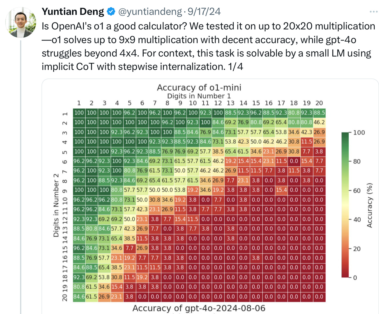 We can see the same thing on integer arithmetic. Fall off on increasingly large multiplication problems has repeatedly been observed, both in older models and newer models. (Compare with a calculator which would be at 100%.)