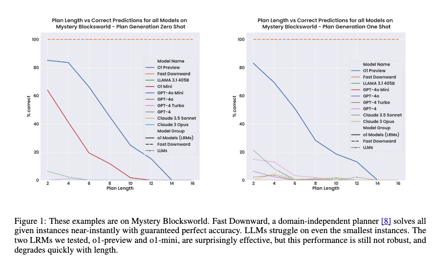 Another manifestation of the lack of sufficiently abstract, formal reasoning in LLMs is the way in which performance often fall apart as problems are made bigger. This comes from a recent analysis of GPT o1 by Subbarao Kambhapati’s team:
