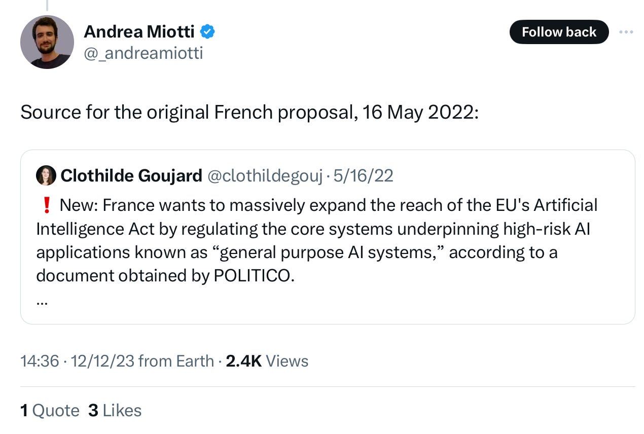 The first mention of foundation models (sometimes referred to as General Purpose AI) didn’t come at the last minute last week. It didn’t come earlier in December. It didn’t come in November, it didn’t come in October. It didn’t come from me or from Sam Altman when we spoke at the Senate in May when we talked about regulating AI. If fact it didn’t even come in 2023, at all. It didn’t even come in November 2022, when ChatGPT was released.