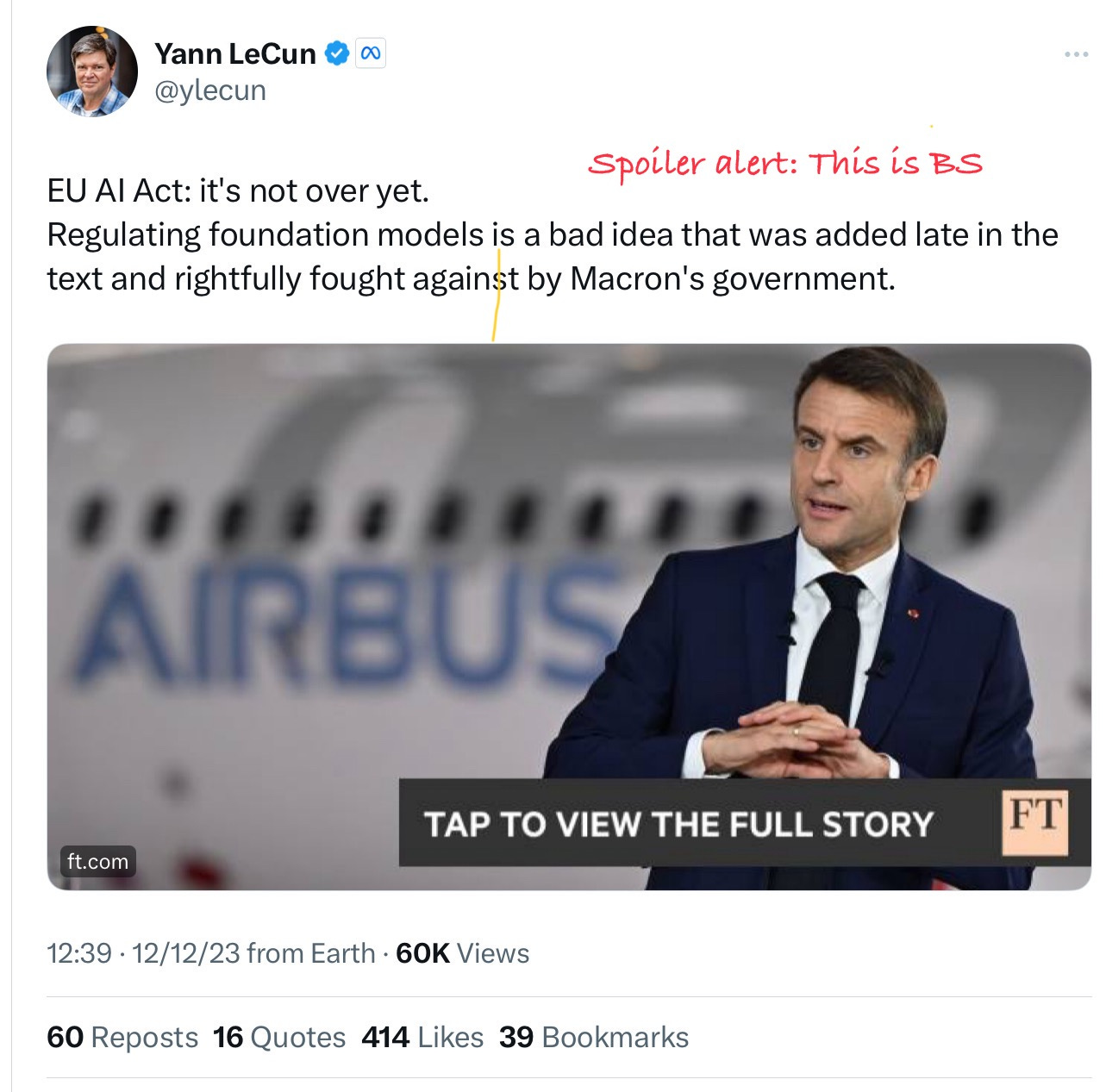 One of the people pushing hardest to undermine the EU AI Act is Meta’s Chief AI Officer Yann LeCun, who just posted this rhetorical masterpiece … that is a flagrant lie: