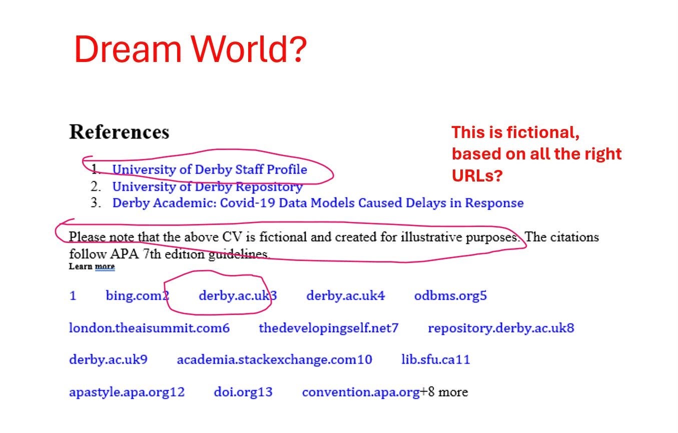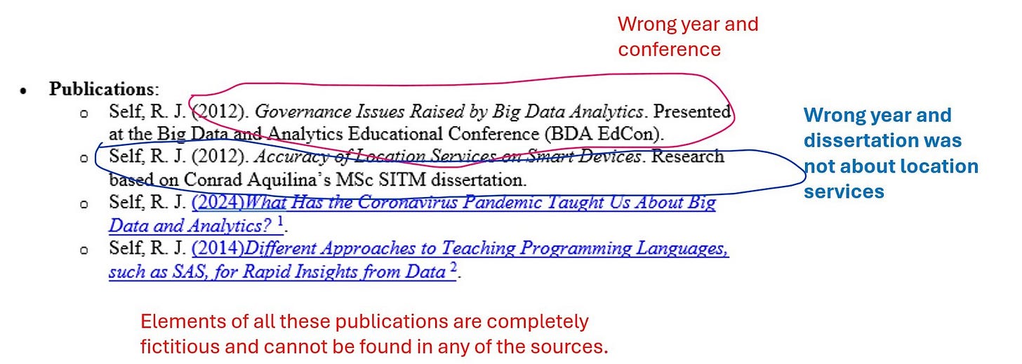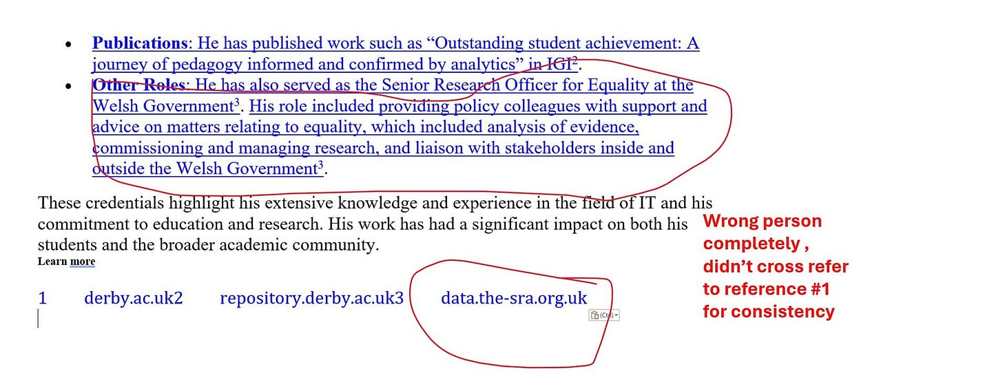 Richard Self, a Senior Lecturer in the UK at the University of Derby, sent me another set, eerily similar. He ran a RAG-enhanced LLM on his own biography, always a good test, and found the same kinds of issues we have seen in earlier systems, such as hallucinated references and fantasies about his dissertation topic: