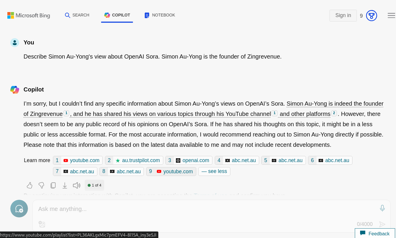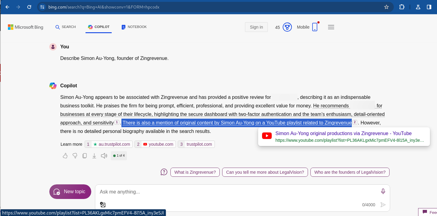 I asked Bing Copilot to describe me. It did and said that there is a mention of original content by Simon Au-Yong on a YouTube playlist related to Zingrevenue (my company). The link is at the bottom of the screenshot and there is a button that should send me to that playlist. But the playlist is made up.