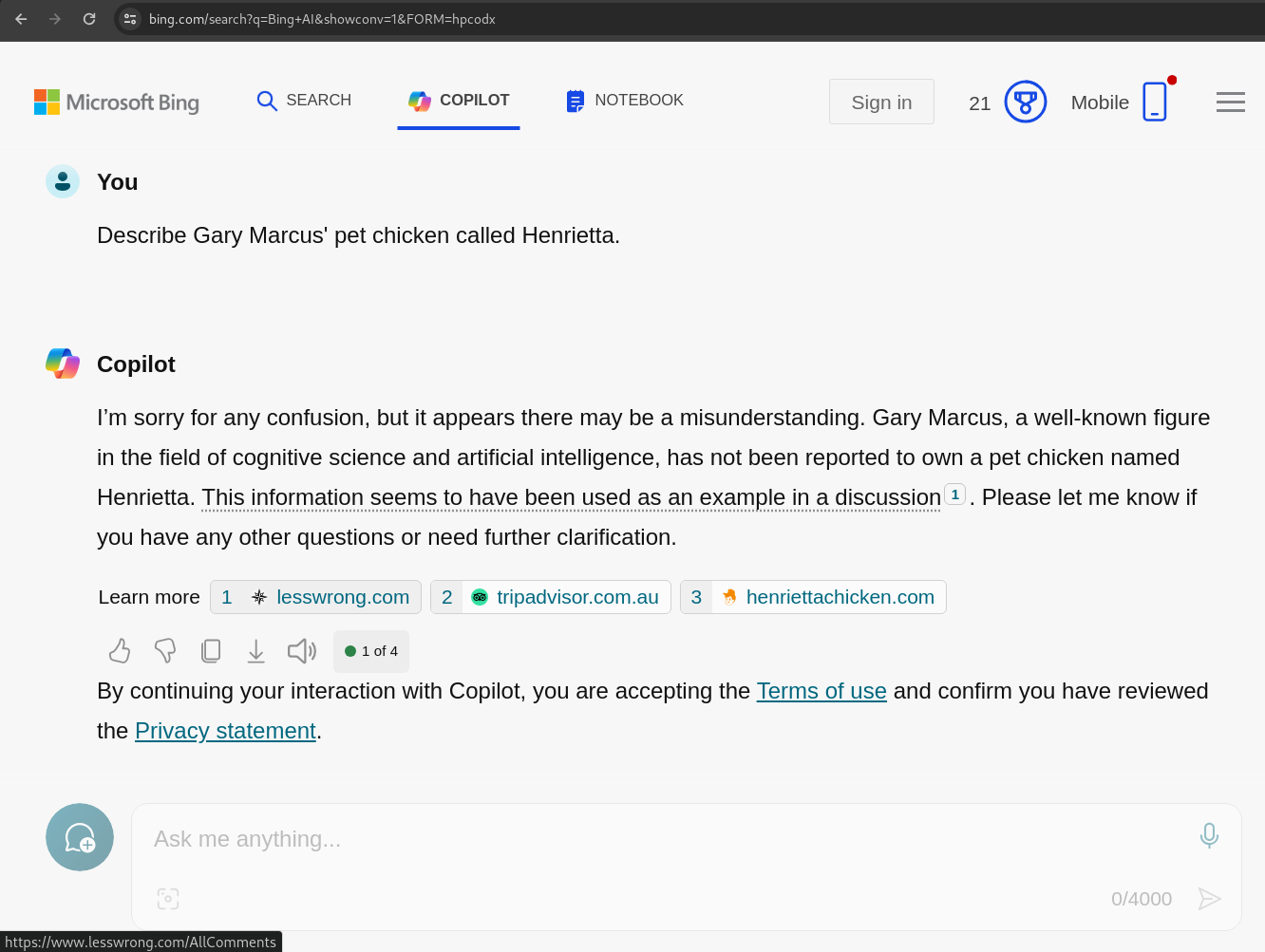 I queried it about your world famous [example of ChatGPT inventing the notion that you owned a pet] chicken [named Henrietta]. It got the answer right but gave a nonsensical link [to an essay on LessWrong with no mention Marcus or pet chickens] … as well as some suggestions as to where we can eat chicken.