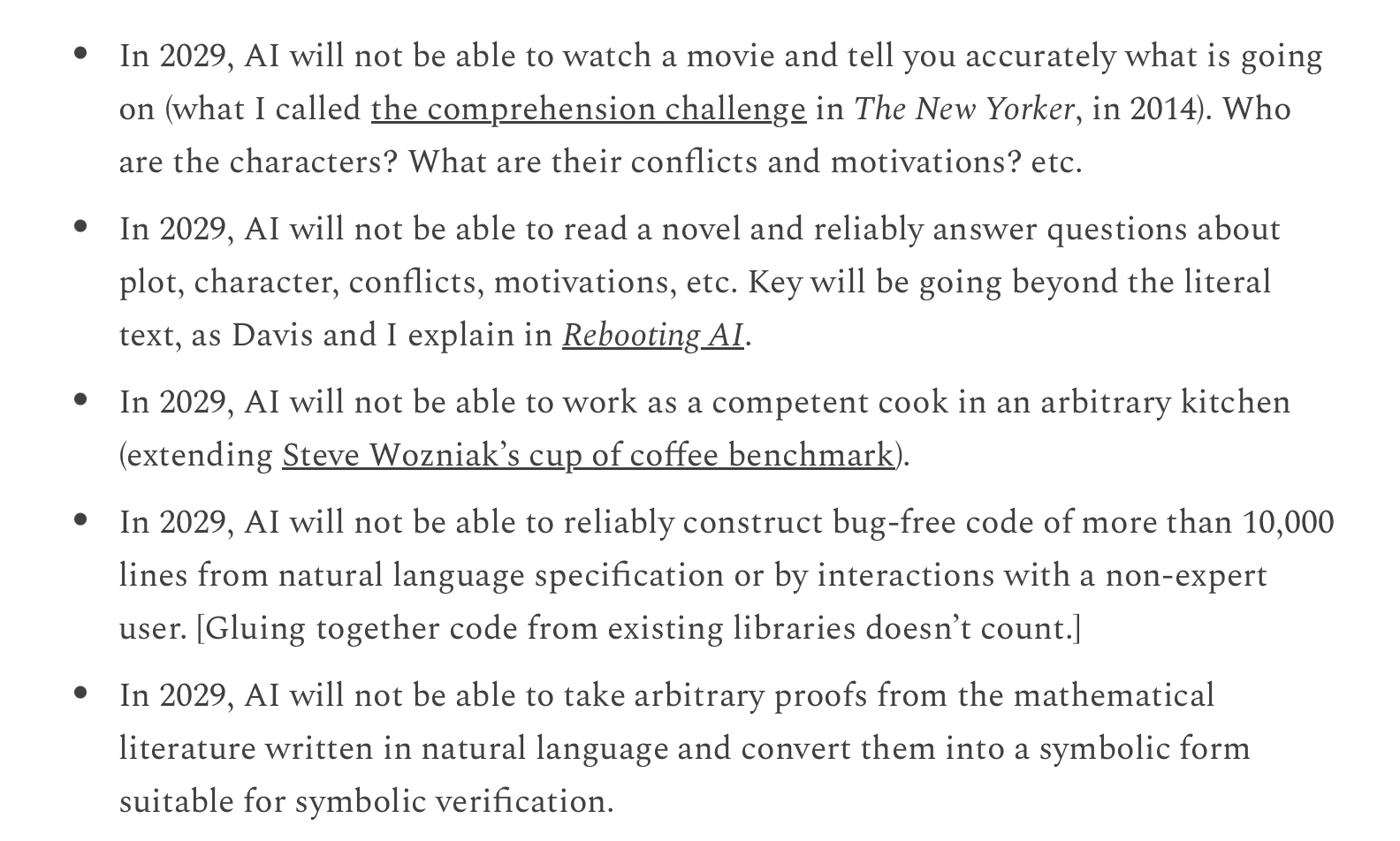 Things have actually changed, quite a bit, in a subtle way.A year and half ago, when I offered Elon Musk a bet about when AGI would come, the field generally thought my criteria were reasonable. (The Long Now foundation offer to host the bet, and Metaculus posted them on their prediction site). Three were things that ordinary untrained humans could do, but two were not. 18 months ago, before the LLM euphoria, we all took for granted that AGI wasn’t just about beating ordinary humans.