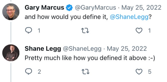 I seriously doubt it. It’s also (as discussed below) not quite how he and I publicly discussed the term last year; in my view it’s a subtle redefinition that dramatically moves the goal posts. Before we get to where the goal posts were, let’s talk about where Legg wants to put them now: beating typical human performance more or less across the board.