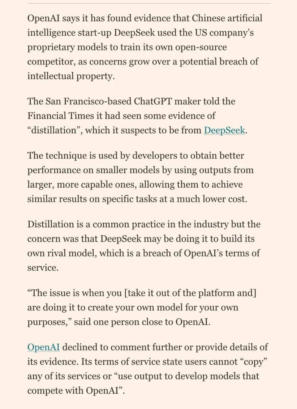 This seems plausible. DeepSeek may well have broken OpenAI’s Terms of Service and distilled1 their intellectual property without permission.