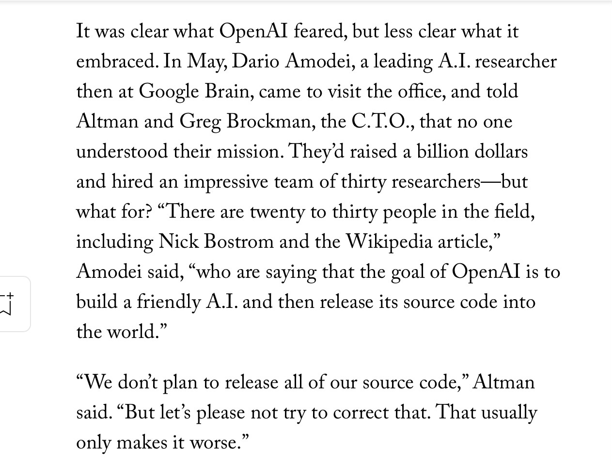 And the story gets worse. After I posted the startling email above on X, someone else unearthed something from The New Yorker that is arguably even more damning, a description of a May 2016 meeting, when it had already become apparent that many people had come to believe that OpenAI meant Open-sourced AI for all: