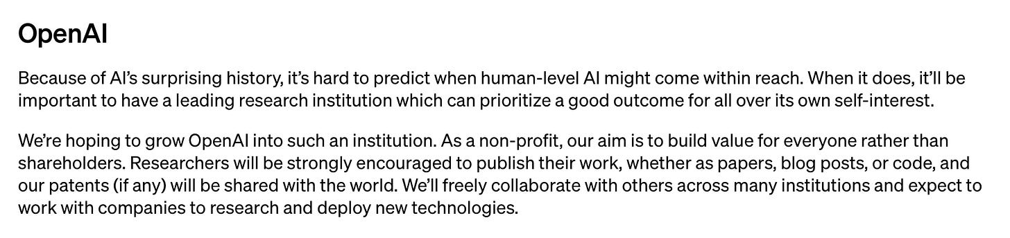 That statement is dubious. The original mission, according to public statement and legal filings, was to be “unconstrained by a need to generate a financial return”, “not organized for … private gain”, “seek[ing] to open source technology where applicable.” Their opening statement to the world, December 15, 2015 was a statement of selfless beauty; had they stuck to it, I might still be in their fan club: