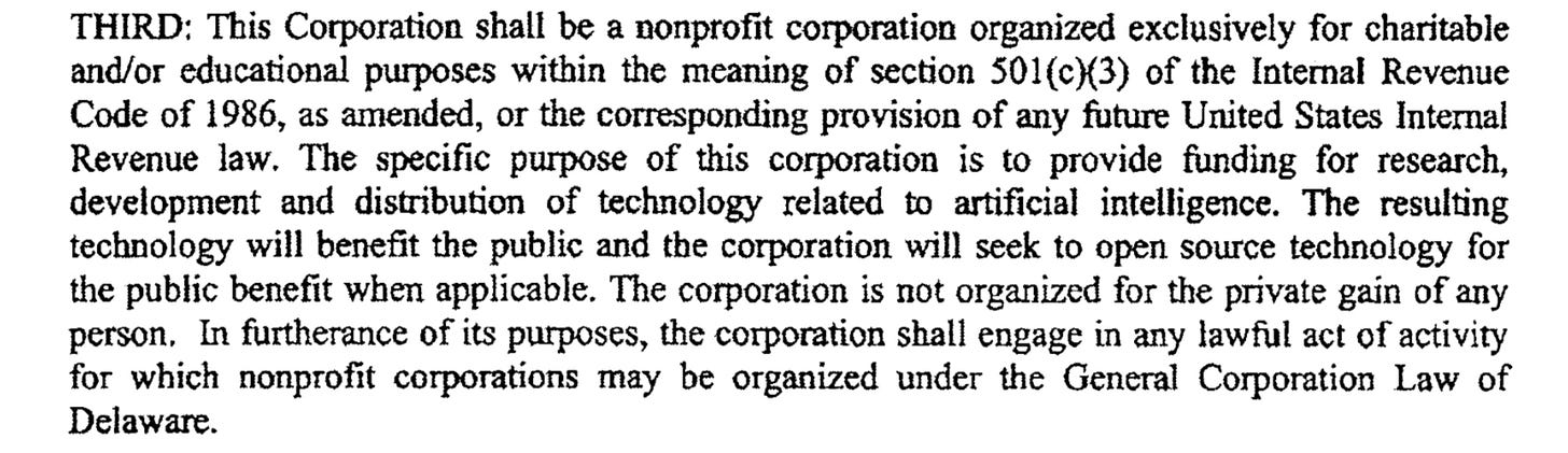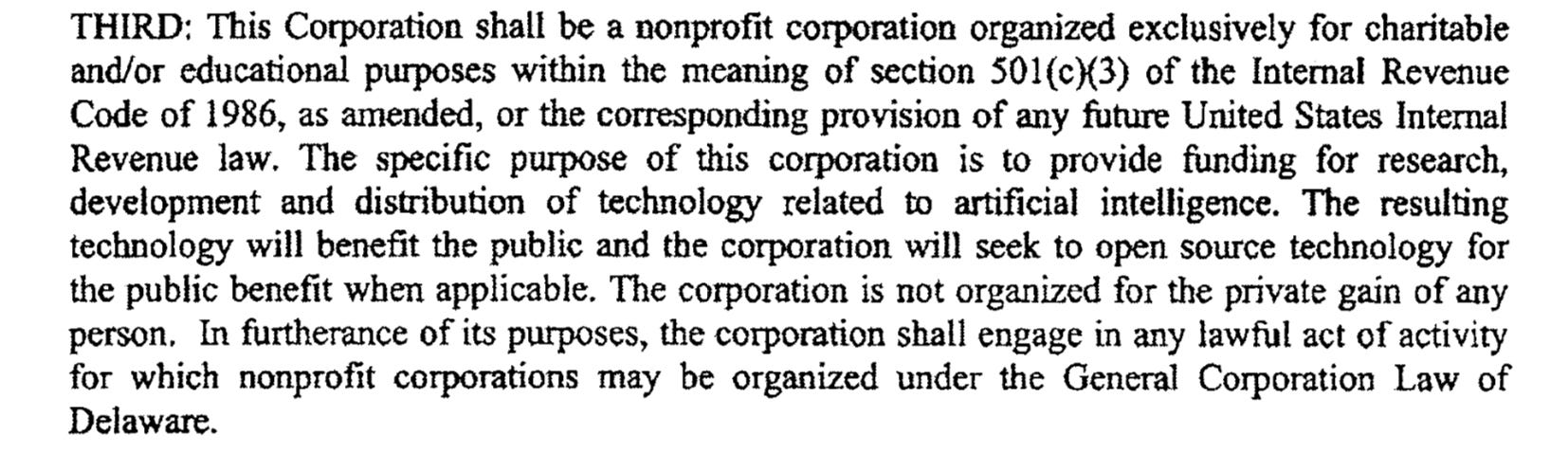 The thing is OpenAI told the State of California that (a) it would be a “charitable organization” and (b) that it would open source its technology “for the public benefit when applicable.” The two facts that have come out make it look like they never really intended to follow their own charter.
