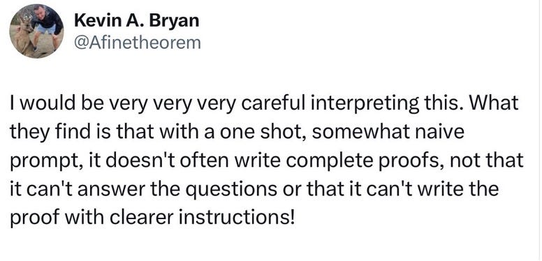 Moreover, however you slice it, this need of the AIs for special cajoling before they will think carefully about questions that are presented to them is a serious weakness, and the demand for special prompting tilts the scale. The high school contestants in the USAMO do not have to be encouraged to think hard about the problems; they are altogether aware that that’s necessary. If indeed the AIs could solve more of these problems with better prompts, then that’s evidence in favor of their mathematical ability but it’s evidence against their ability to judge the right thing to do on their own.