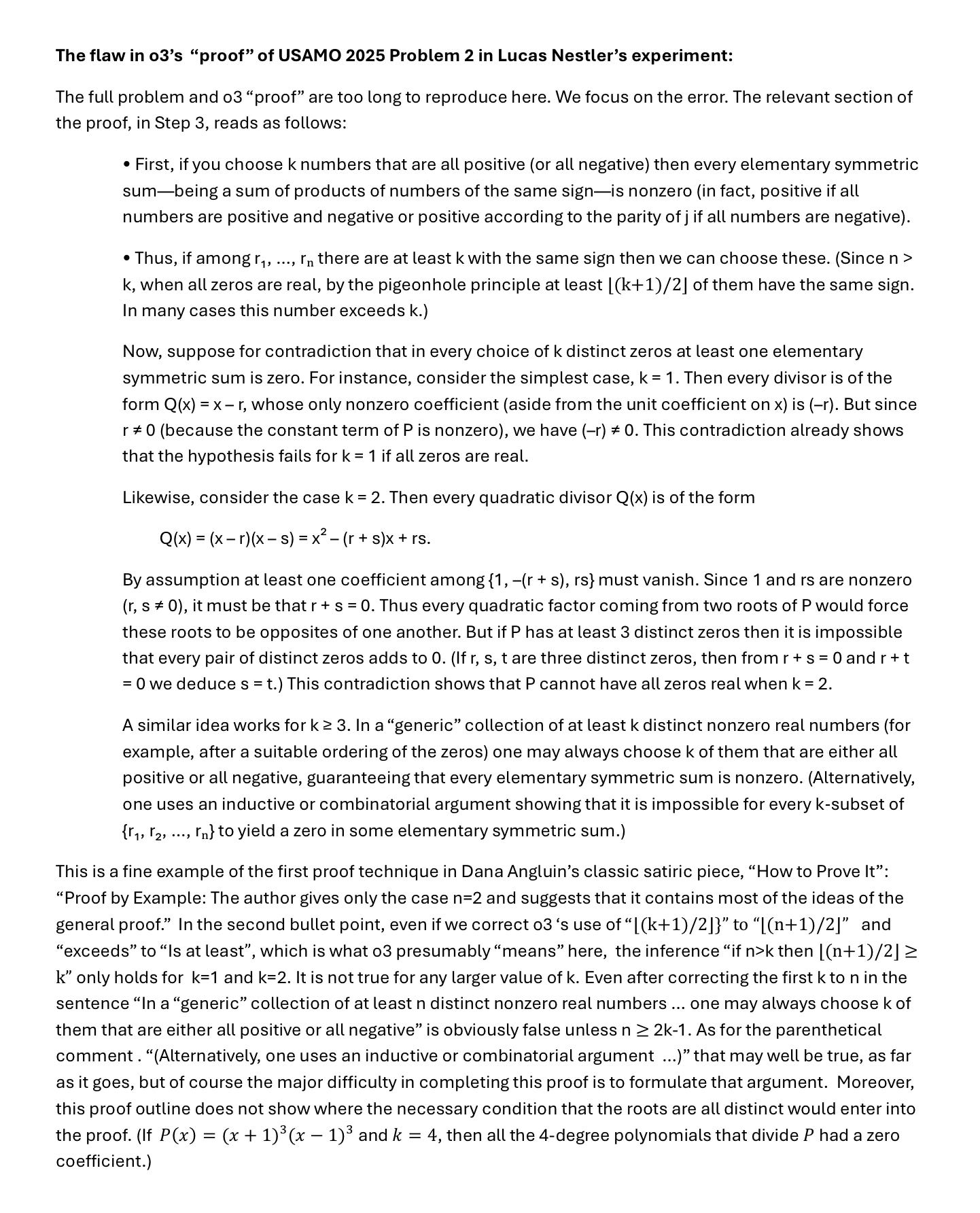 So Nestler’s experiment does not contradict the finding of the report; it corroborates it. o3, yet again, produced an invalid answer to this problem. It also confirms how dangerous this kind of failing is. The AI output a “proof” that looked plausible to Nestler led Nestler to make a fool of himself in public by outrageously accusing reputable scientists of fakery. (To a trained mathematician, the error in Nestler’s own proof is pretty obvious once pointed out.)