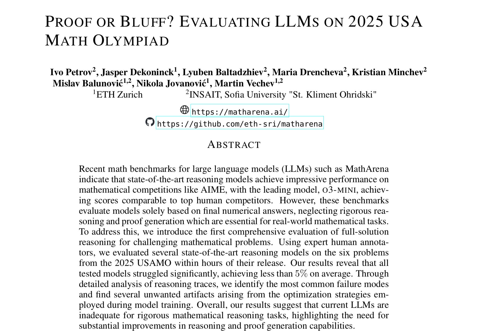 The USA Math Olympiad is an extremely challenging math competition for the top US high school students; the top scorers get prizes and an invitation to the International Math Olympiad. The USAMO was held this year March 19-20. Hours after it was completed, so there could be virtually no chance of data leakage, a team of scientists gave the problems to some of the top large language models, whose mathematical and reasoning abilities have been loudly proclaimed: o3-Mini, o1-Pro, DeepSeek R1, QwQ-32B, Gemini-2.0-Flash-Thinking-Exp, and Claude-3.7-Sonnet-Thinking. The proofs output by all these models were evaluated by experts. The results were dismal: None of the AIs scored higher than 5% overall.