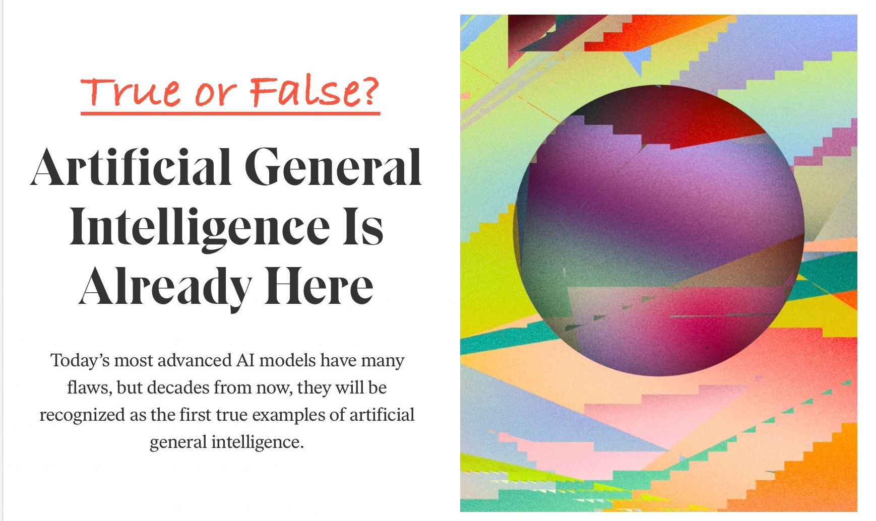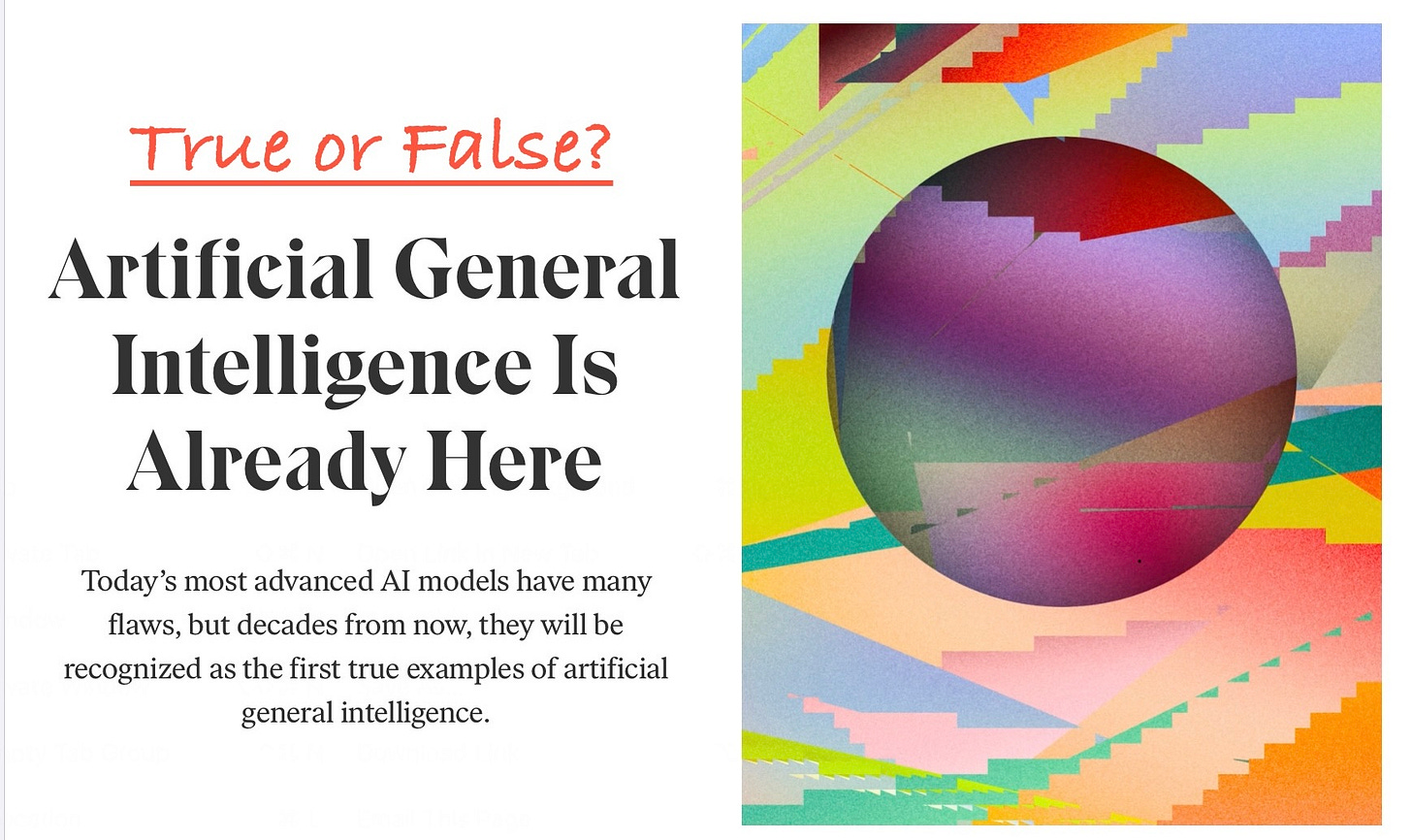 Agüera y Arcas and Norvig describe the ways in which large language models (LLMs) can carry out tasks for which they were not specifically trained; they claim that this ability is key to being an AGI; and they argue that therefore the kernel of AGI has been achieved. They conclude with a long, condescending discussion of the various reasons that some pitifully confused people are “reluctan[t] to acknowledge [that] AGI has already arrived.”