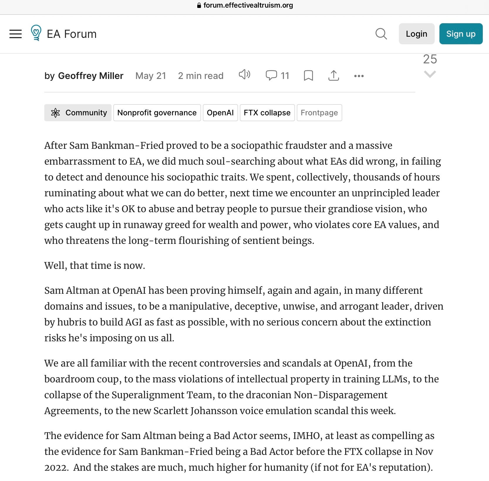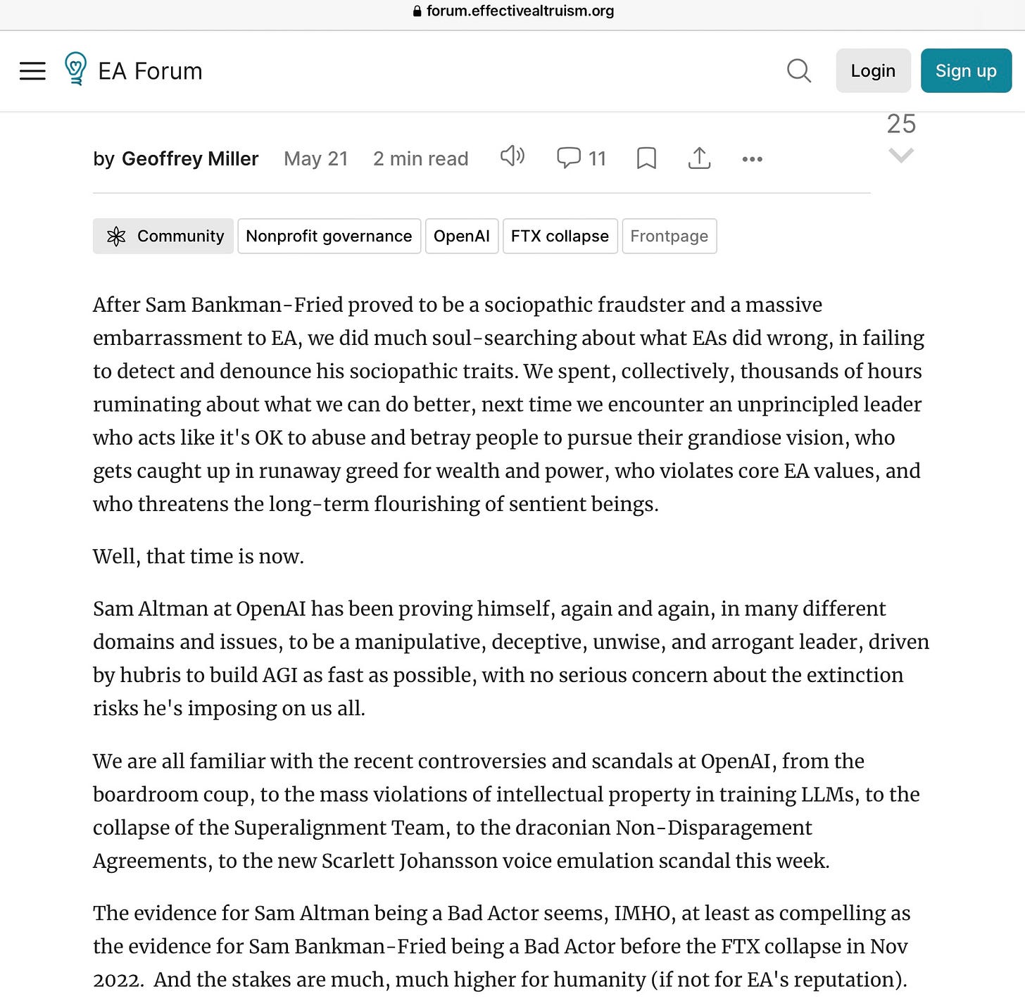 And maybe even more brutal, posted on the effective altruism forum, by Geoffrey Miller: