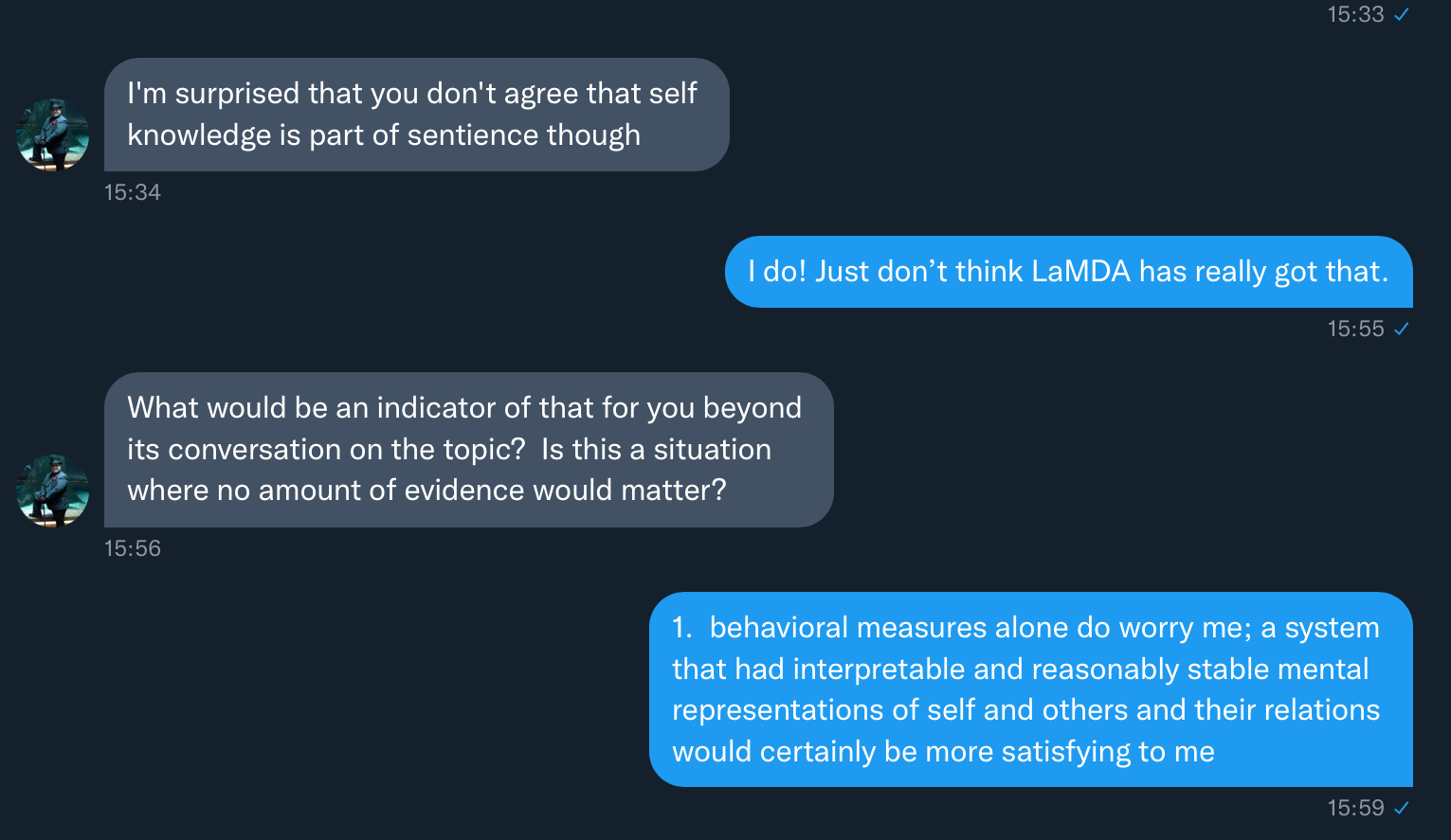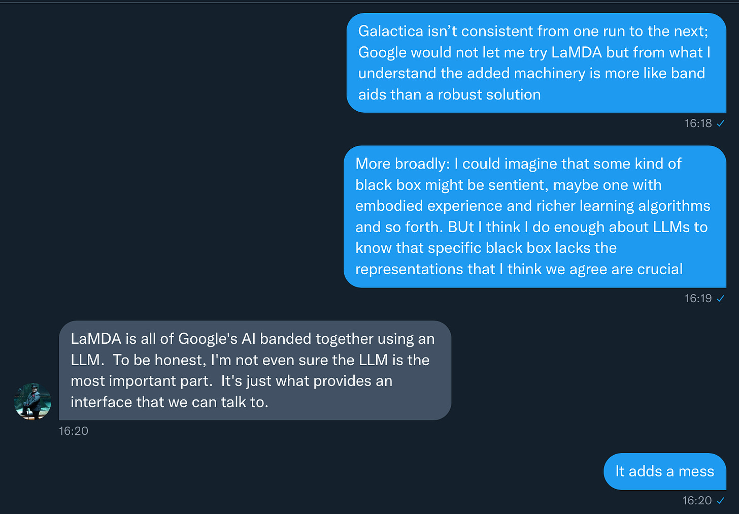 Lemoine was pretty harried the last time I tried to engage him in conversation. (The infamous Washington Post article about him had by coincidence landed just as he was about to go on his honeymoon, and the press inquiries were nonstop for a long time.)