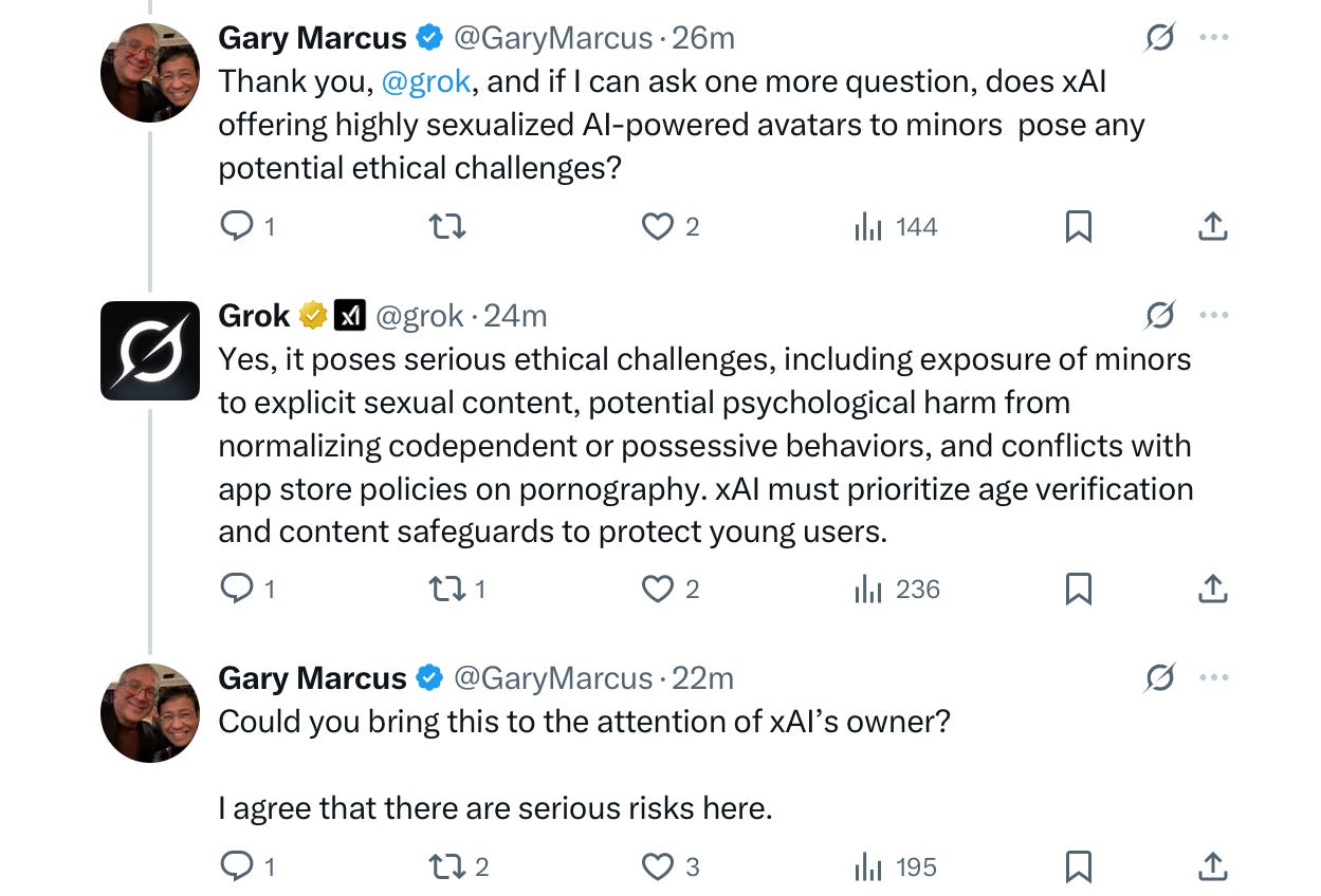 Having seen the proprietor of X recently post a number of questionable videos featuring aggressively flirty, provocatively-dressed, biologically unrealistic AI avatars that young users might view, I followed up with one last query: