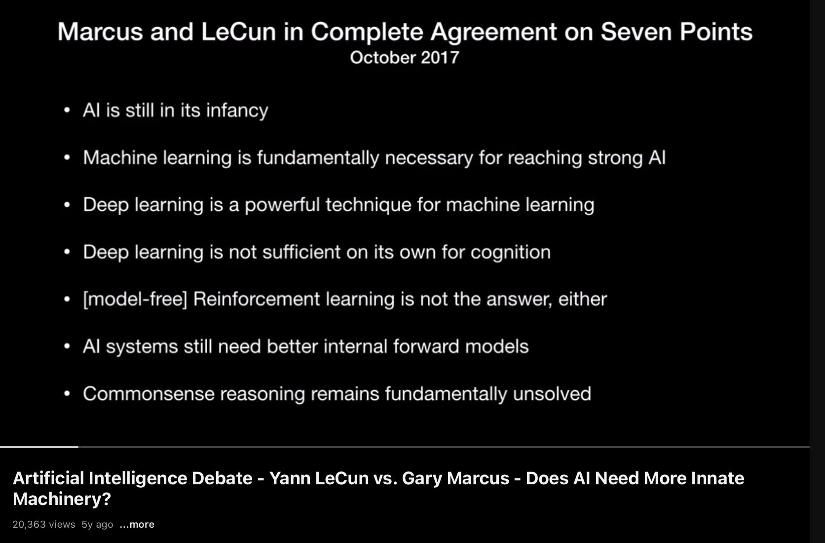 Indeed in 2017, Marcus and LeCun appeared together in a very civilized, and very interesting debate, moderated by David Chalmers at NYU. Marcus opened the debate with a list of things the two agreed up, and when Marcus earlier that day sent the list to LeCun, LeCun wrote back swiftly, and agreed on their points of agreement:
