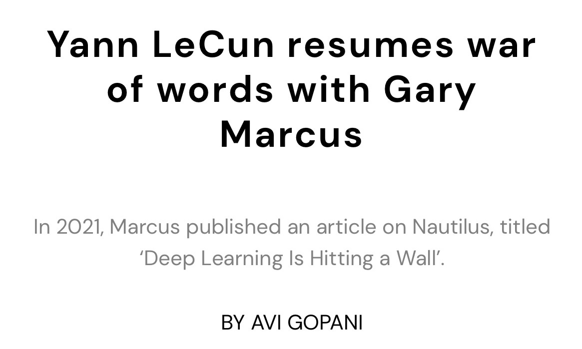 Most people think of Gary Marcus and Yann LeCun as matter and anti-matter (or perhaps the other way around). But that wasn’t always the case. One upon a time Gary Marcus and Yann LeCun were friends; they did a number of public events together, and even appeared side-by-side in a famous photo together, which LeCun posted on Facebook, at the time describing Gary Marcus as his favorite critic. (Later, immediately after LeCun won the Turing Award along with Hinton and Bengio, the photo circulated again, with Marcus cropped out).