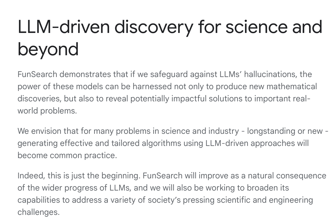 Google DeepMind, along with the mathematician Jordan Ellenberg really did use some AI to help solve a math problem, in a very clever paper that is worth reading, on how to use “program search with large language models” (as the accurate and not at all hypey title explains).
