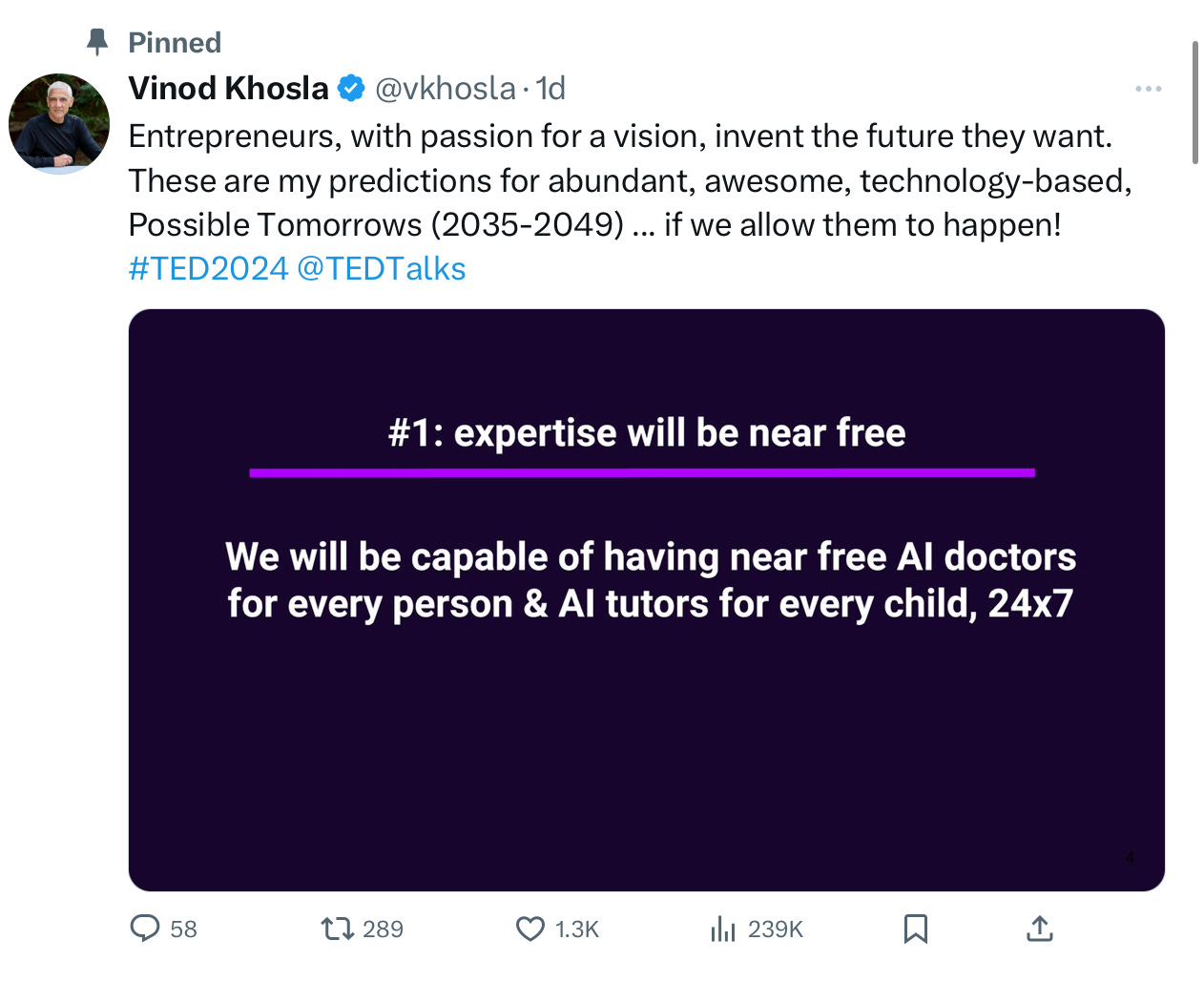 Vinod Khosla’s techno-optimistic talk was far more substantive in my view, and to his credit, he understood that carving a better future isn’t just about surrounding humanity with empathetic chatbots. Khosla made a dozen fairly specific predictions, in multiple areas, ranging from medicine to agriculture to infrastructure. He has a quick summary on X, and here are a couple excerpts that speak for themselves.